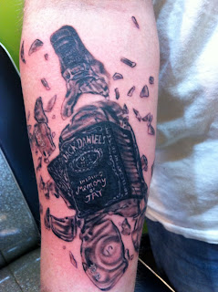 Strangely enough I started the day with another boozy tattoo, a memorial, for Jeff's brother. The above picture is a healed picture (taken June 1st, two months healed with the exception of the white ink), and the below photo is immediately after completion.